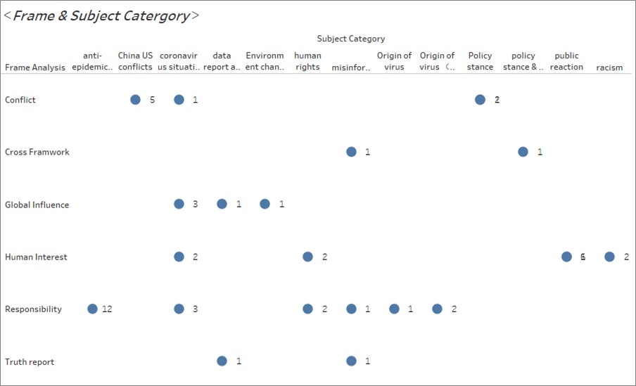 There are other two frameworks are Truth Report and Cross Frame accounting for the same 3.8% of the total. Truth Report means that the reports are based on the data or simply describe the truth without any comments or emotional preference. It includes two subjects which are Data Report Analysis which only show the data and pictures and Misinformation which is the clarification of some misinformation messages. The Cross Framework includes Conflict & Global Influence which is related to the subject of Policy Stance & Coronavirus Situation and Truth Report & Responsibility which is about Misinformation.