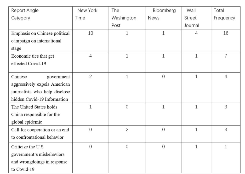 This research focuses on news reports from March ,2020 to Early-May ,2020. The targeted reports all come from four U.S. media giants –New York Times, Washington Post, Wall Street Times, and Bloomberg. By searching key words like “China” “Covid-19” “U.S.-China relations in Coronavirus”, the research first gets access to relative reports superficially touching on the key words. Then by dint of sifting out those articles merely use those keywords but not deeply involves China-related discussions, comments, opinions, the research gains the most valuable and effective 32 samples in the end.
