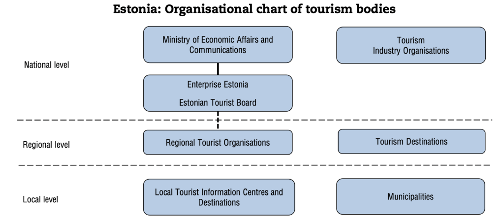 In the development of the tourism industry in Estonia, the government organized and formed affiliated companies to help Estonia promote tourism development. Through attending some international conferences, Estonia has demonstrated itself well in such processes and has improved its national image. A non-profit organization like the Estonian Tourist Board (ETB), established jointly by the public and private sectors, also assisted in Estonia’s tourism industry’s booming. According to OECD Tourism Trends and Policies 2014, ETB works with interested businesses and companies, and its products and services add value to the Estonian image building.