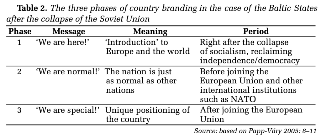 As for Estonia, the image they choose is to be a European nation rather than a Baltic nation. To accomplish its goal, they commissioned the job to a British consulting company named Interbrand. Interbrand conducted a series of campaigns, emphasizing Estonia’s connection to Europe rather than to the Baltic nations while disconnecting any possible affiliation with the Soviet Union. The effort of Interbrand earned Estonia the privilege to hold the Eurovision Song Contest in 2002. Despite the fact that Estonia commissioned different companies later, this effective pattern of cooperation has stayed.