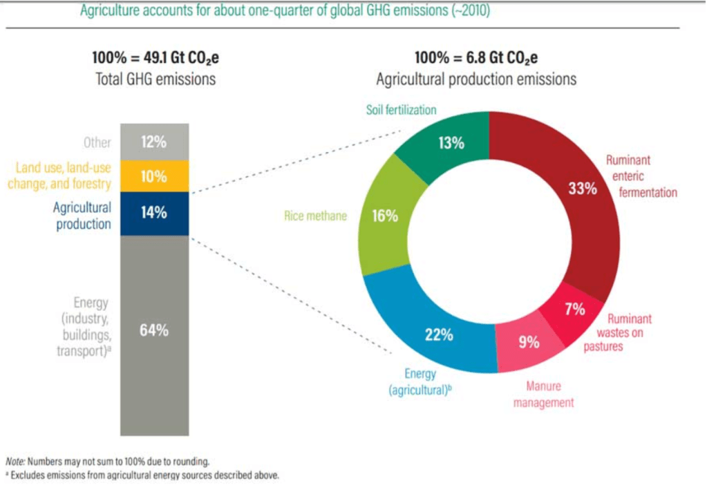 On the other hand, agriculture and related land-use change is already generating as much as 25% of the global annual greenhouse gas (GHG) emissions that cause climate change. In particular, it contributes 44% of methane (CH4), which is a much more potent greenhouse gas than Carbon dioxide (CO2). Per unit of mass, methane is 84-86 times stronger than CO2 over 20 years and 28-34 times as powerful over 100 years.